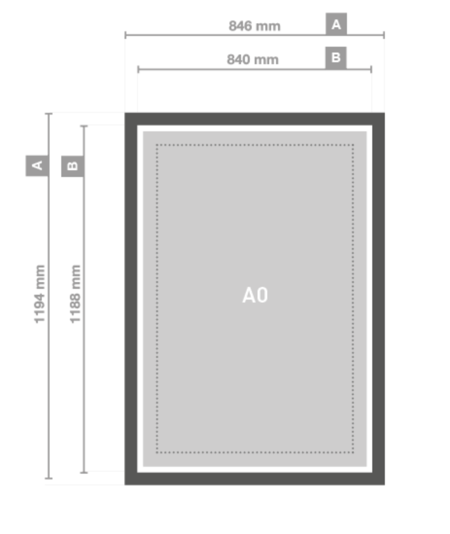 Een A0 heeft een flink formaat. Het A0 formaat is het grootste formaat in de A standaard en ook het uitgangspunt voor A-formaten. De A0 formaat afmetingen zijn: